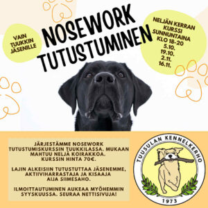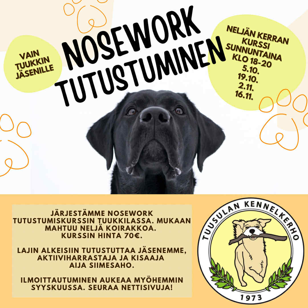Tuusulan Kennelkerho järjestää neljän koulutuskerran Nosework tutustumiskurssin TuuKKilassa syksyllä 2025. Lajin alkeisiin tutustumisen koulutukset ovat joka toinen sunnuntai-ilta klo18-20 (sis. etsintäalueen rakentamisen ja purkamisen) 5.10., 19.10., 2.11. ja 16.11. Mukaan mahtuu neljä koirakkoa. Kurssin koirakkohinta on 70€ ja kuunteluoppilas ilman koiraa 20€.