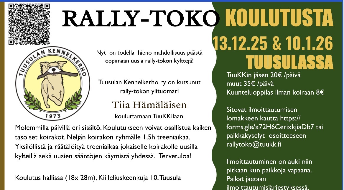 Rally-tokon ylituomari Tiia Hämäläinen tulee kouluttamaan rally-tokoa 13.12.2025 ja 10.1.2026 TuuKKilaan. Koulutuspäivä on avoin kaikille, eli voit ilmoittautua vaikka et olisikaan TuuKKin jäsen! Koulutuspäivät ovat keskenään eri sisältöisiä, joten kannattaa ilmottautua molempiin.